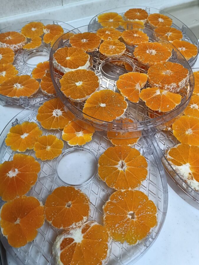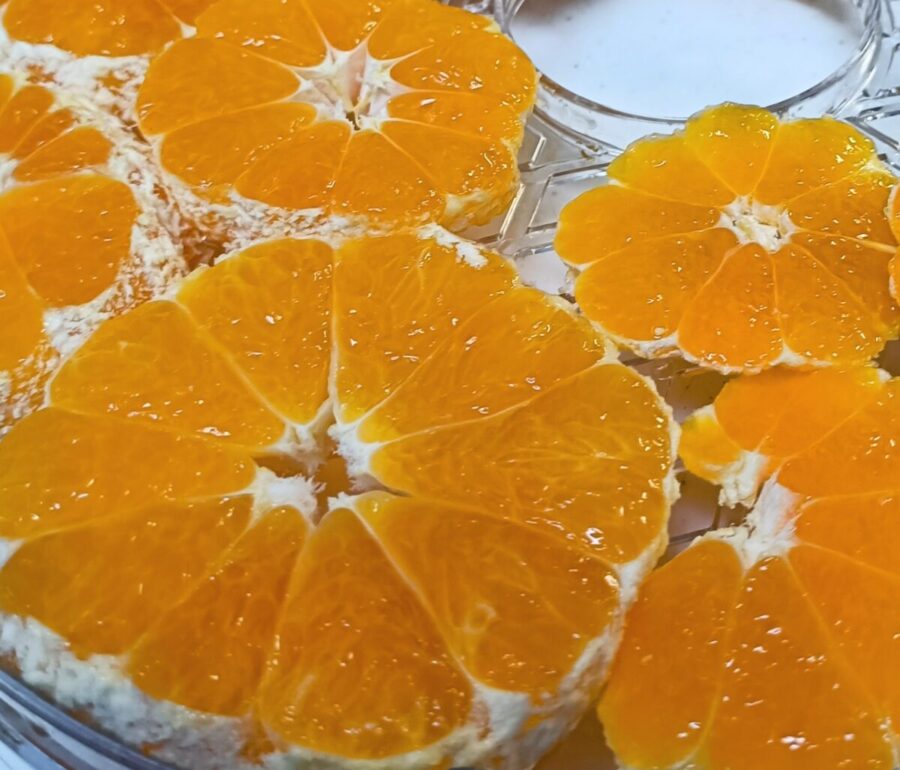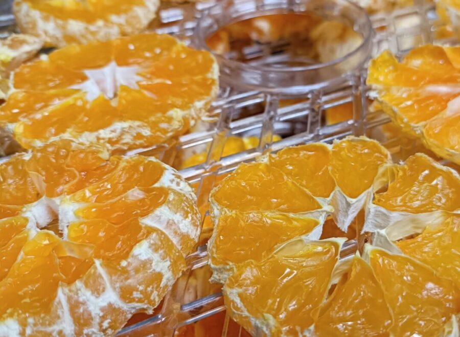 スライスみかんをフードドライヤーにセットしたらあとは待つだけ……なんだけど、糖分を多く含むみかんはトレイにくっつきやすいので、途中で何度かひっくり返しながら乾かしていきます
