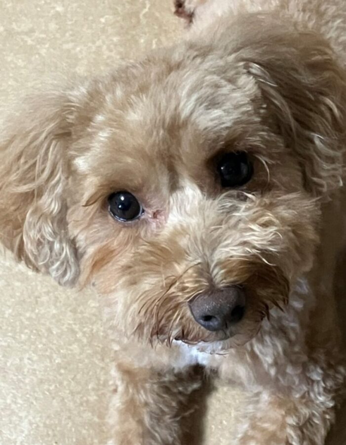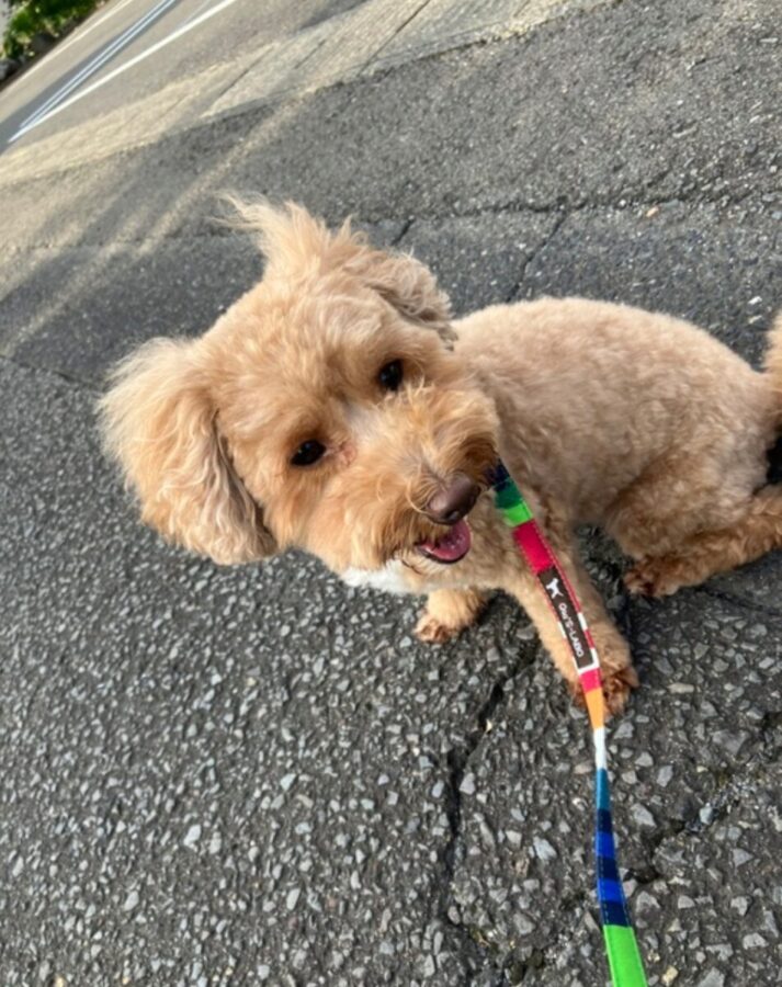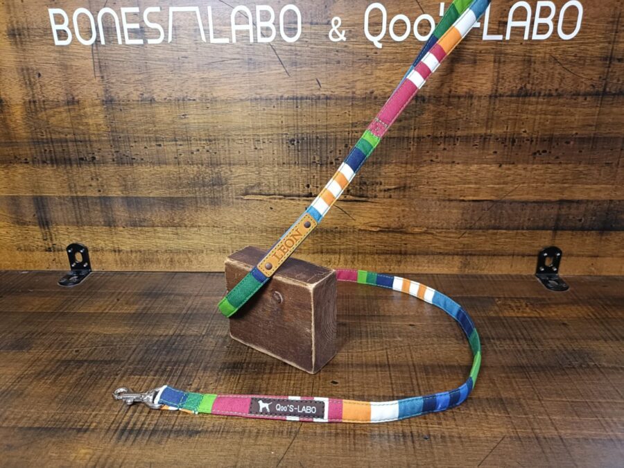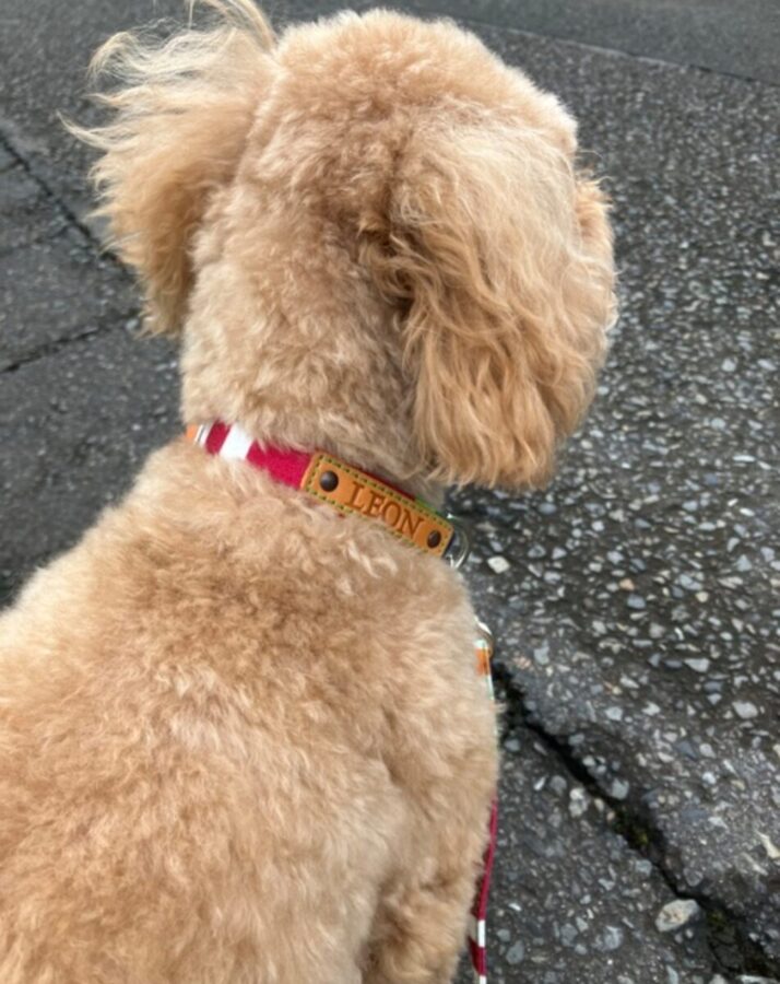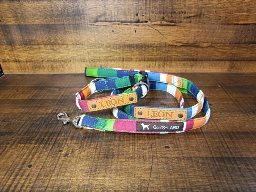 淡色ブラウンのレオン君の被毛に色鮮やかなカラフルが綺麗に映えてとても素敵ですね✨